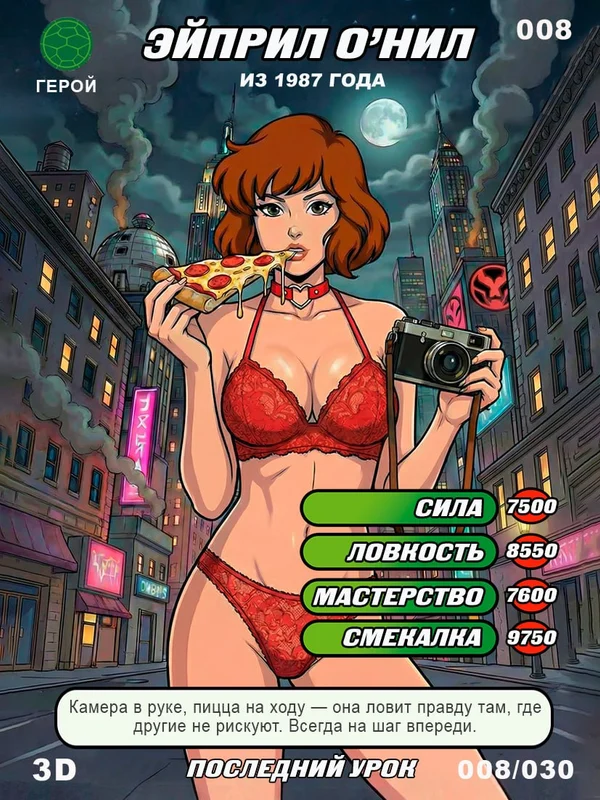 🟢 Эйприл О’Нил (1987) — бесстрашная репортёрша, всегда оказывающаяся в центре самых опасных событий.