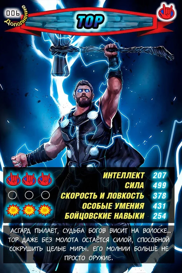 Это не просто герой — это сама буря в человеческом облике. Тор не нуждается в доказательствах: его сила говорит за него, а молнии подчиняются одному лишь взмаху руки. Когда он выходит на поле, бой превращается в стихийное бедствие, где исход предрешён ещё до первого удара.